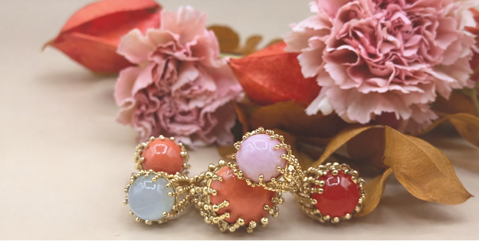 Comme des gouttelettes d’or, elles magnifient la pierre fine en œil de tigre, malachite, turquoise, corail, onyx, opale…