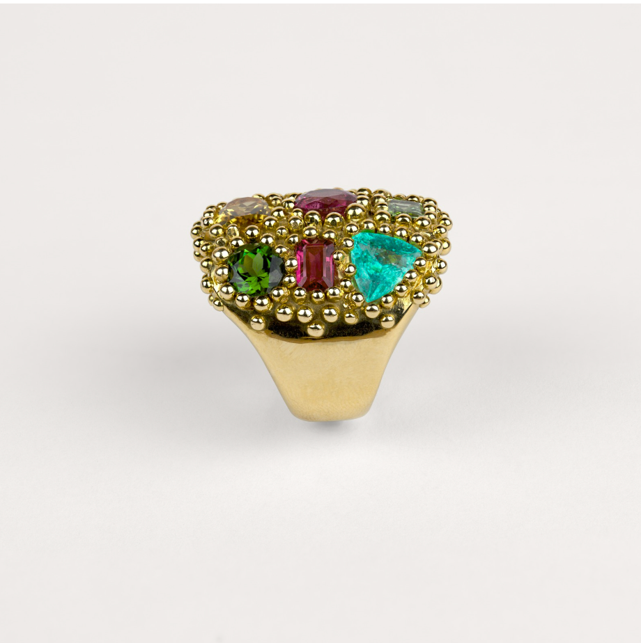 Bague poudre d'escampette tutti frutti Cabinet de curiosité tourmaline paraiba, tourmalines jaune, rose, fuchsia, verte, grenat spessartite orange et or jaune recyclé 18k 750/1000