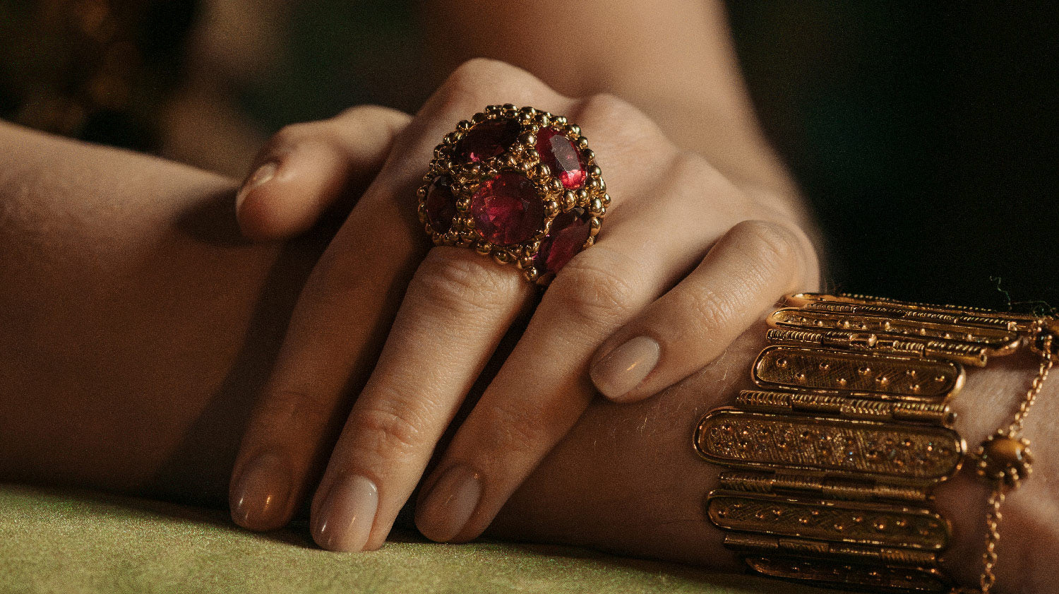 Bague caraba Cabinet de curiosité rubellites facettées poire, grenats tsavorites, spessartites cognacs et oranges, diamants et or jaune recyclé 18k 750/1000