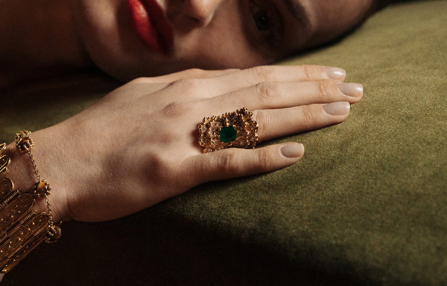 Bague jungle en folie Cabinet de curiosité émeraude taille rectangulaire, diamant et or jaune recyclé 18k 750/1000