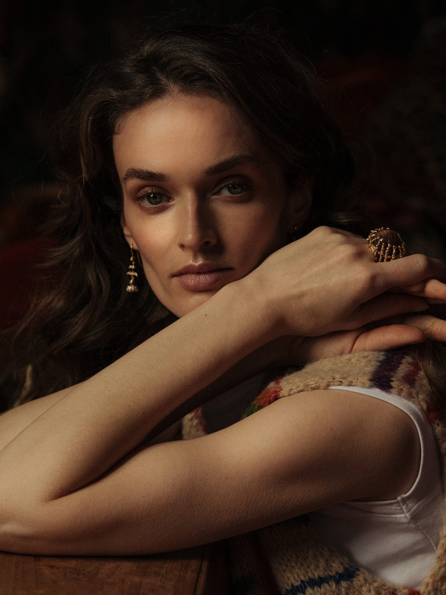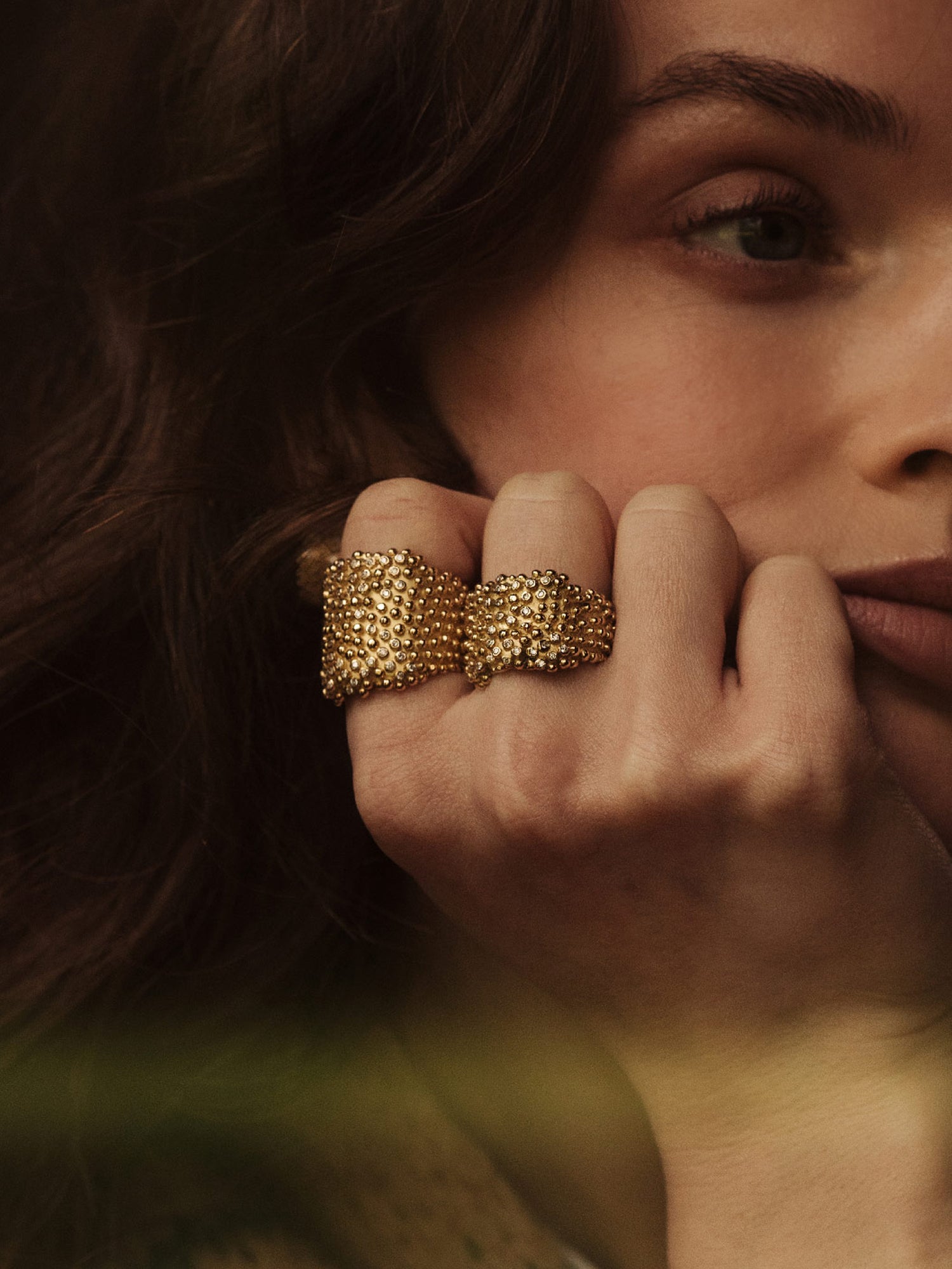 Les gouttes d’or – marque de fabrique de la Maison – parsèment de manière aléatoire une large bague aux pourtours subtilement organiques. Leur forme et taille, comme dans la nature, varient au gré d’un hasard parfaitement dessiné.