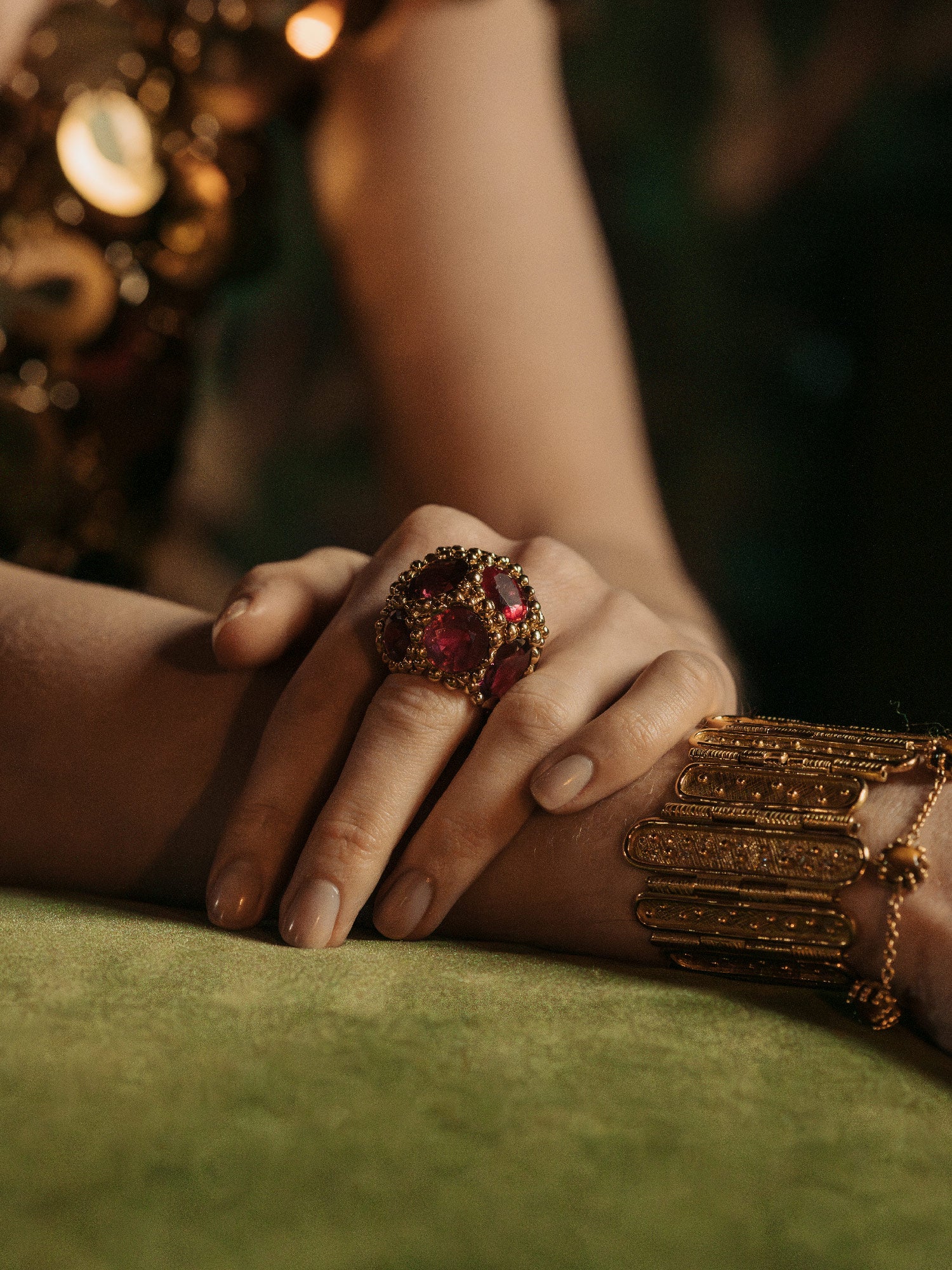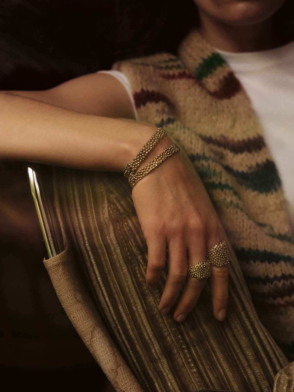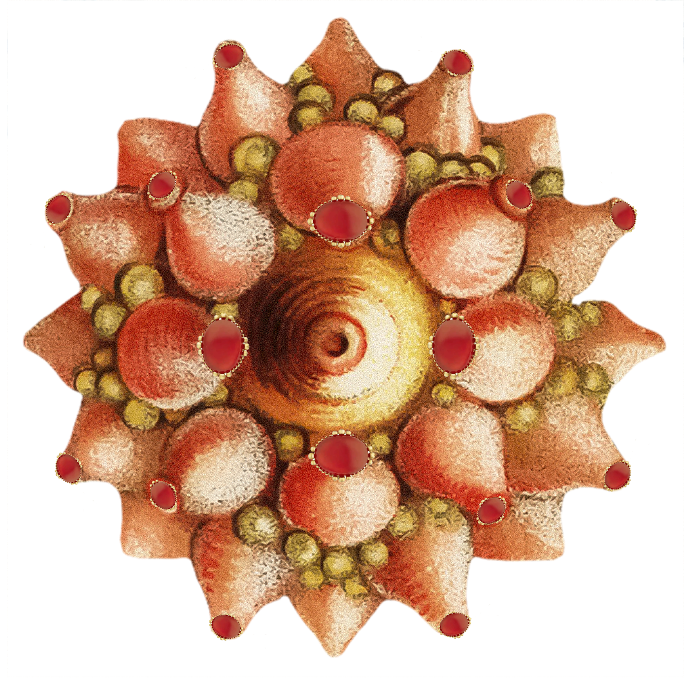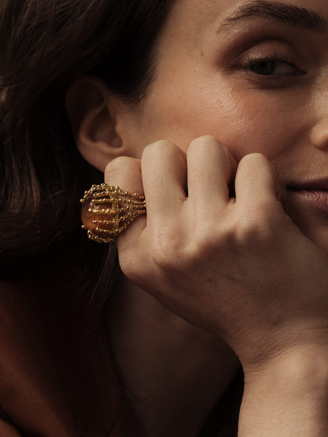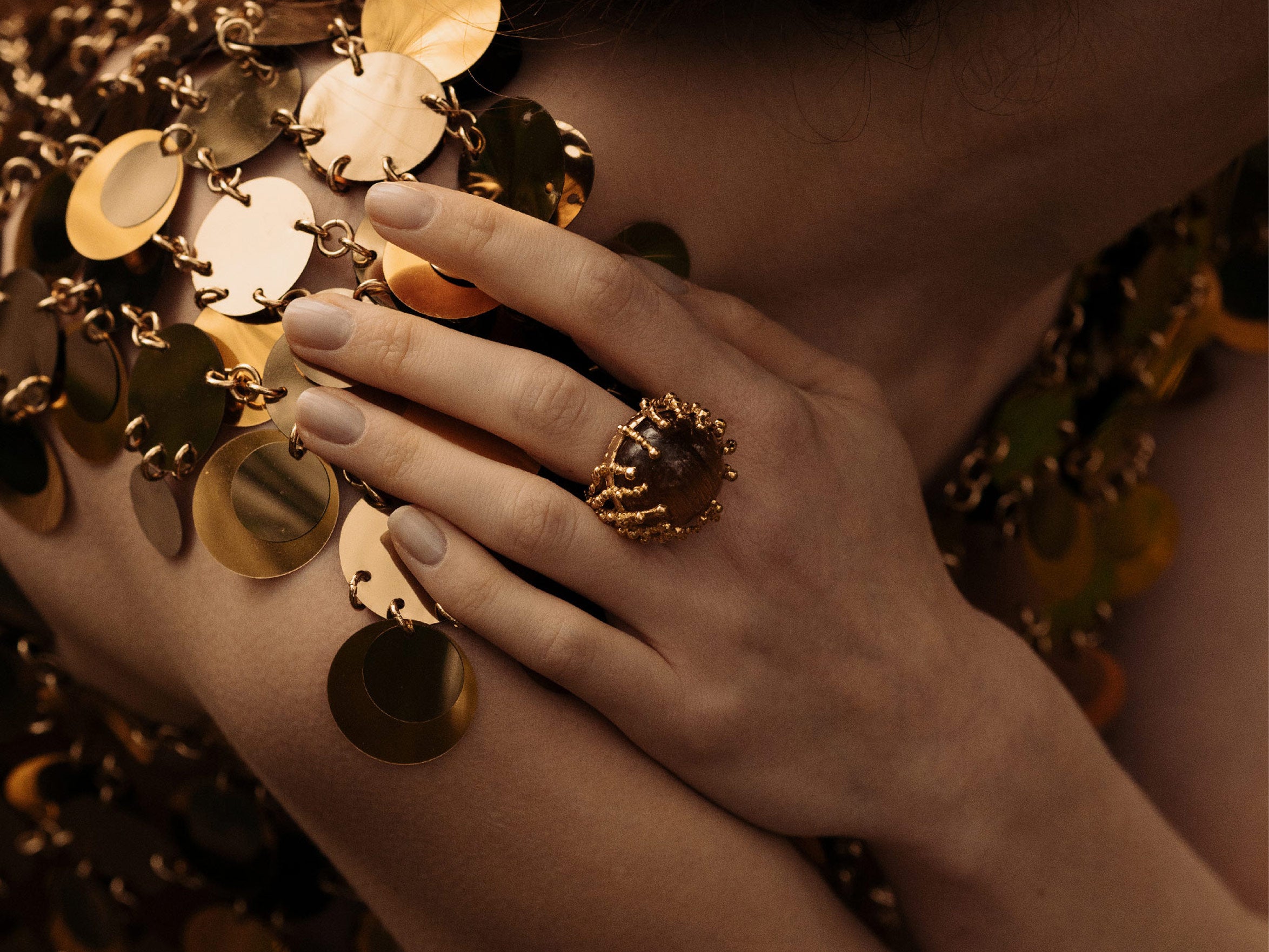 Les petites boules irrégulières d’or – jaune ou blanc - enlacent amoureusement la pierre de centre, protectrices, autant que réceptrices du gemme. Comme des gouttelettes d’or, elles magnifient la pierre fine en œil de tigre, malachite, turquoise, corail, onyx, opale…