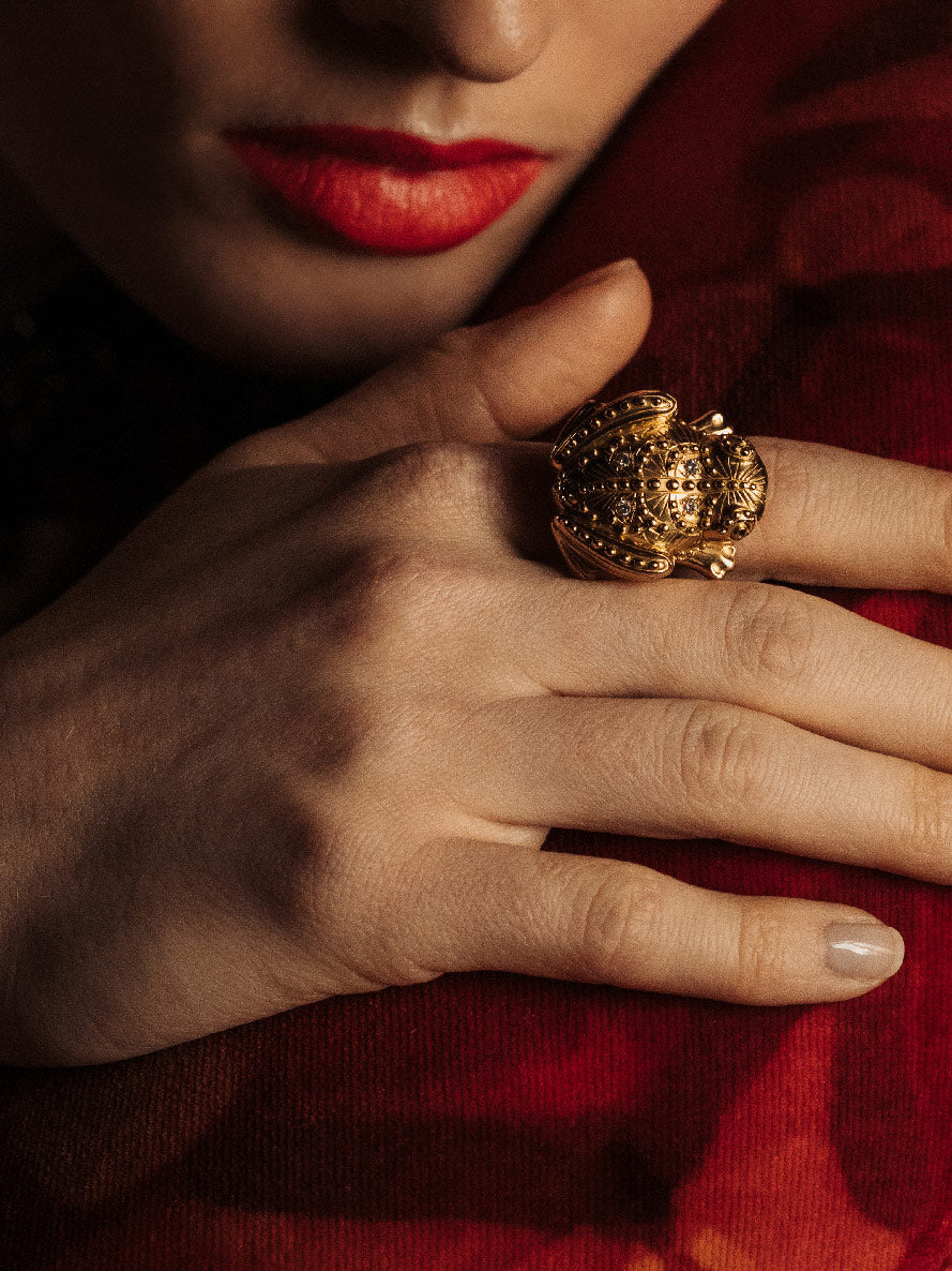 La féminité habite Garnazelle, par la figure de sa créatrice tout d’abord, femme de feu, qui incarne dans ses bijoux cette dimension concomitante à la nature exaltée. Elle s’exprime dans l’univers des formes tout en rondeur, en douceur, en aplomb aussi. Délicate et puissante à la fois, subtile et gaie, symbolique et figurative, l’esthétique de la Maison incarne cette féminité autant solaire que lunaire.